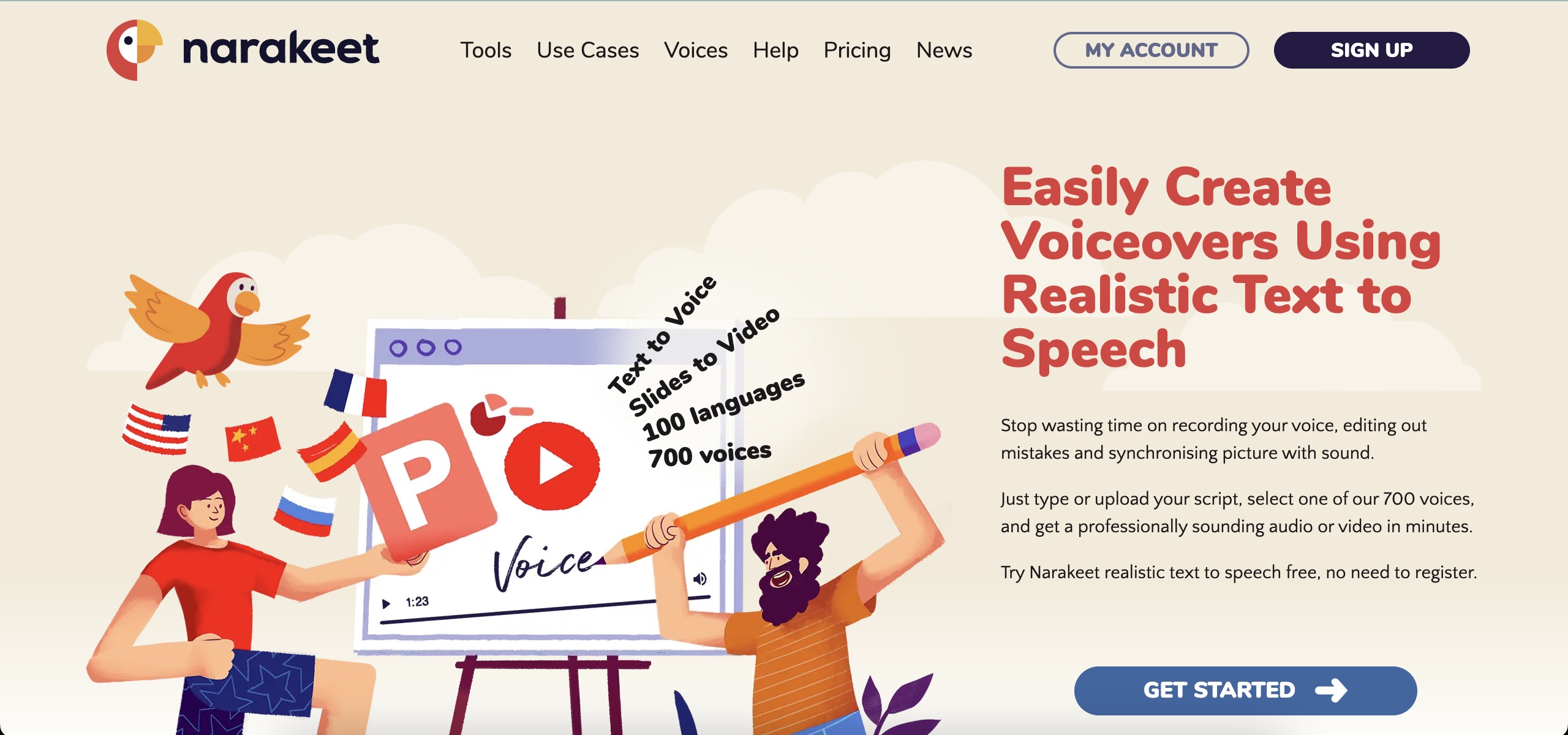 Narakeet is an online service for creating voiceovers and narrated videos without professional audio equipment or advanced editing skills. Using AI, it converts text into spoken audio with over 700 AI voices in 90 languages, ideal for reaching international audiences.