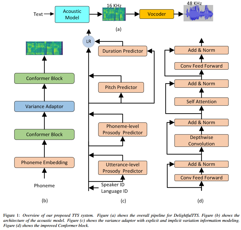 - Non-Autoregressive Architecture: DelightfulTTS employs a non-autoregressive architecture, enabling faster inference compared to autoregressive models while maintaining high speech quality.