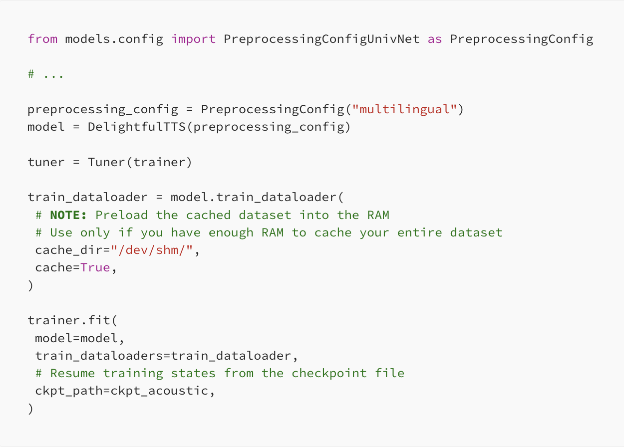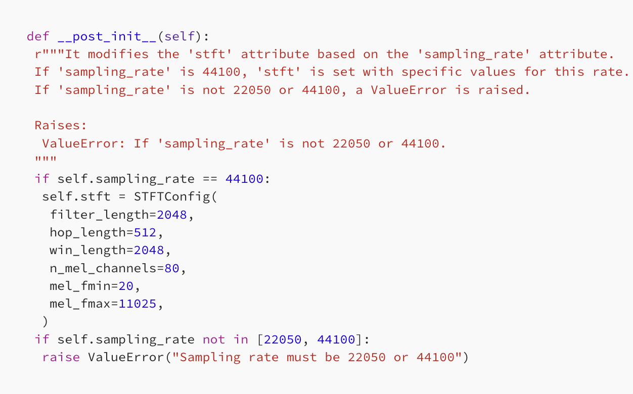 Using PyTorch Lightning to train a model is very straightforward. My training script allows you to train on a single machine with either one or multiple GPUs. I tried to support the hyperparameters and configurations in one place. You can find the configuration in the models/config directory. PreprocessingConfig is the basic piece of configuration where you can set the configuration for preprocessing audio used for training. PreprocessingConfigUnivNet and PreprocessingConfigHifiGAN have different n_mel_channels, and these two configurations are not compatible because this parameter fundamentally defines the architecture of the AcousticModel. For the PreprocessingConfigHifiGAN , we have sampling rates of 22050 or 44100. You can see the post-initialization action that sets the parameters of stft based on this parameter: