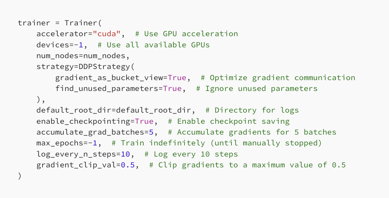 Here’s my Trainer code. I use the DDPStrategy because it’s the only strategy that works in my case. Other useful parameters are: