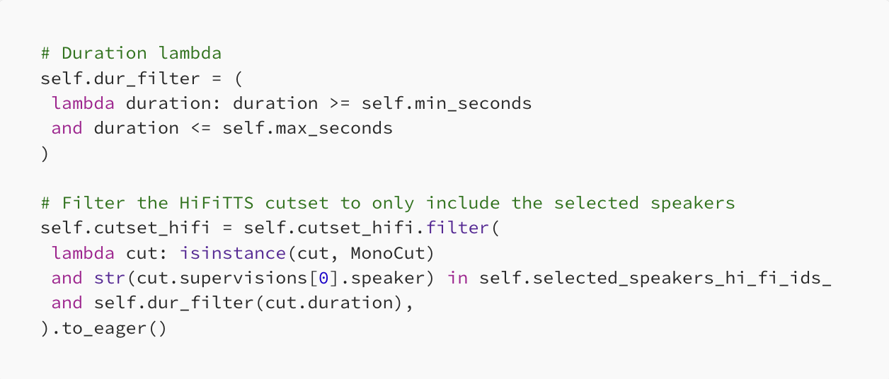 For managing datasets, I utilize the lhotse library. This library allows you to wrap your audio dataset, prepare cutset files, and then filter or select specific subsets of the data. For example: